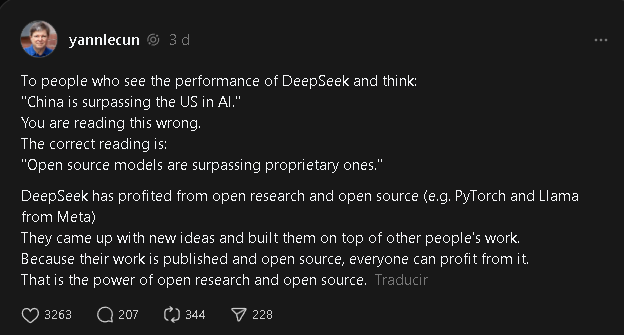 Aquí quiero aclarar un punto importante. Si bien no demerito el ingenioso trabajo de los especialistas que trajeron a la vida a DeepSeek, quiero hacer especial énfasis en que para construir un modelo tan asombroso los creadores se han parado en hombros de gigantes. Por ello este modelo no representa la victoria de un país sobre otro , si no mas bien el triunfo de la comunidad Open Source como el propio Yann LeCun menciono en redes.