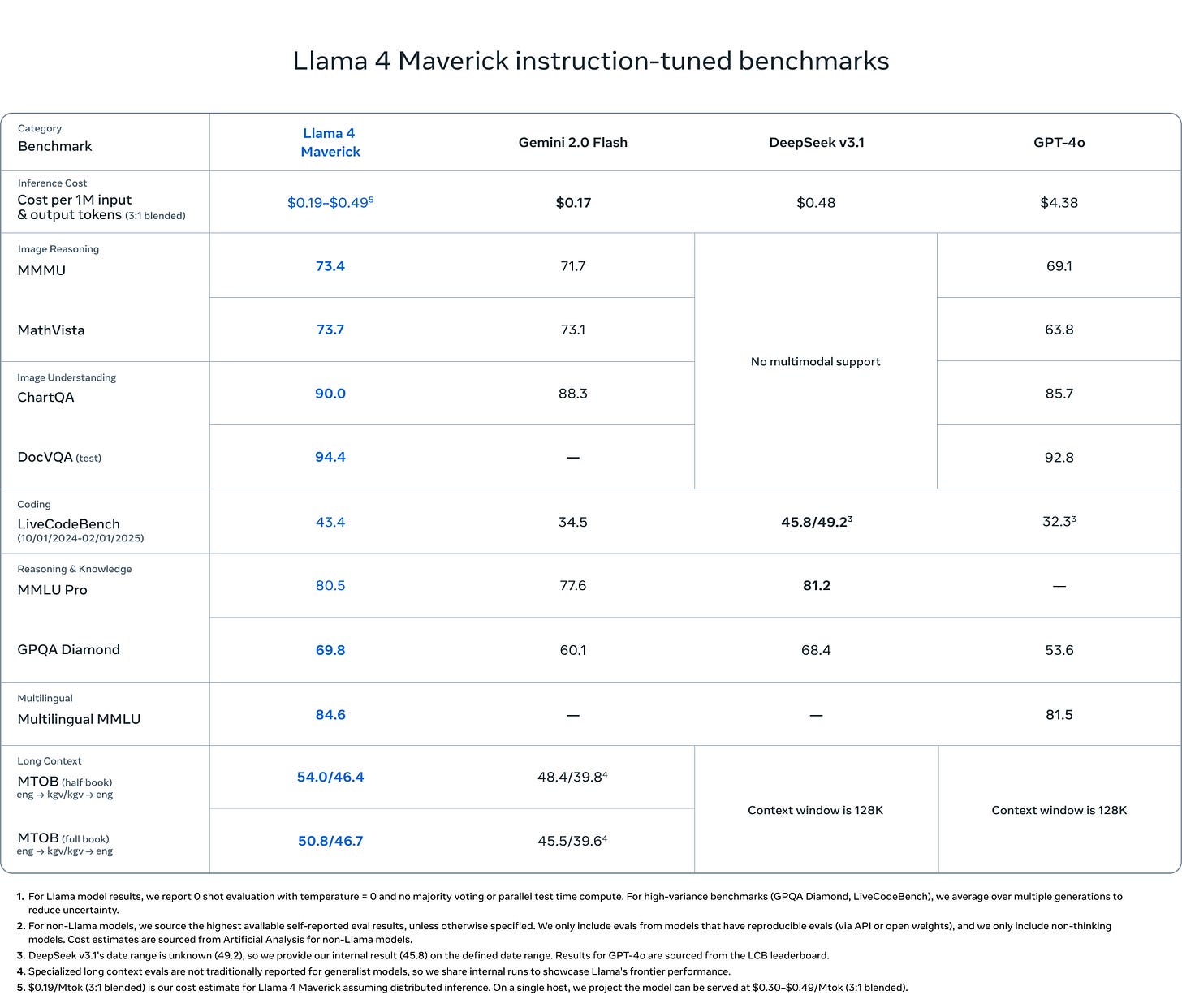 Llama 4 Maverick (17B Activos / 400B Totales, 128 Expertos): Descrito como el "caballo de batalla" para asistentes y chat, diseñado para ofrecer un rendimiento superior en relación costo-beneficio. Meta aseguró que supera a GPT-4o y Gemini 2.0 Flash en benchmarks clave y logra resultados comparables a DeepSeek v3 en razonamiento y código, pero con menos de la mitad de parámetros activos.