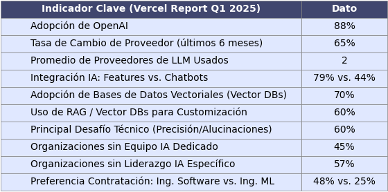 Los datos del informe de Vercel pintan un cuadro detallado del estado actual del desarrollo de IA. En la tabla de abajo, se presentan algunos indicadores clave que contextualizan las tendencias que exploraremos: